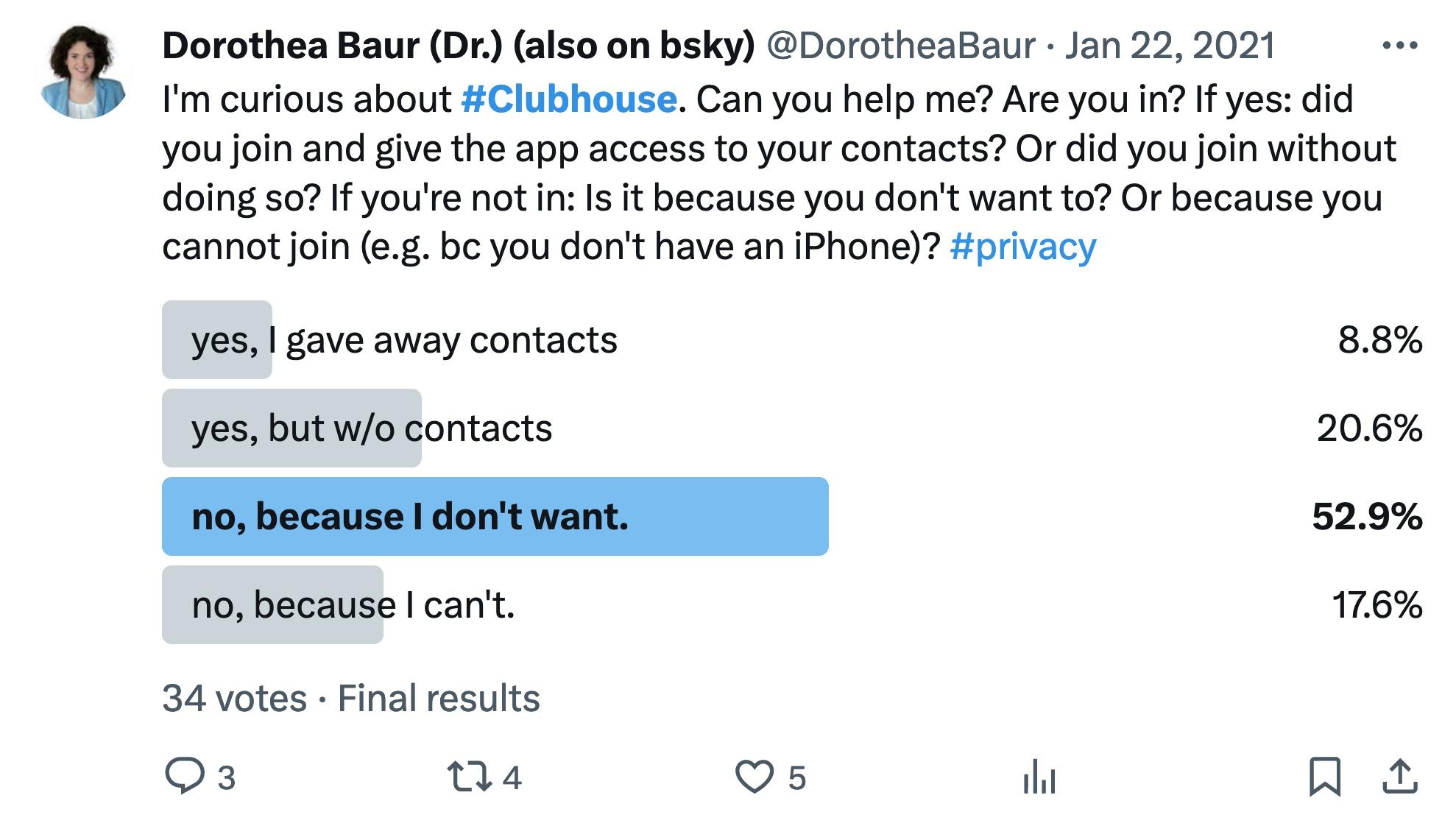To be fair, not everyone who joins Clubhouse is equally thoughtless or even ruthless. Many people say they joined Clubhouse without providing access to contacts. They thus value the privacy of their contacts (and their own privacy, i.e., the right to keep their contacts a secret) higher than the urge to come across as particularly popular or generous. These people do not violate the privacy of their contacts, and even though we might want to take this for granted, we should thank them for that.